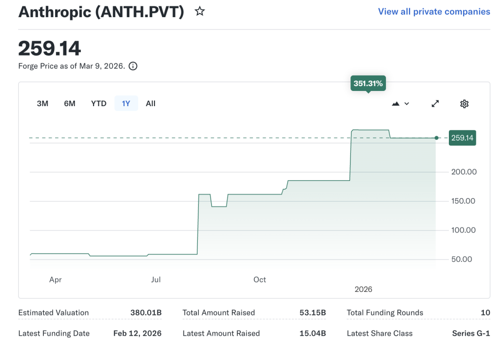 This figure has been climbing along with a wave of money flowing into generative AI startups. The sector could contribute $4.4 trillion annually to the global economy. In addition, recent data shows Anthropic’s share price in secondary markets at about $259.