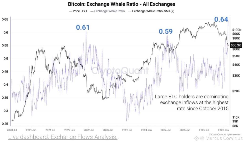 On-chain data reveals that the exchange whale ratio has climbed to 0.64, its highest level since 2015. This indicates that nearly two-thirds of the Bitcoin flowing into exchanges is coming from the 10 largest deposits, signalling that institutional whales and early adopters are leading the exit.