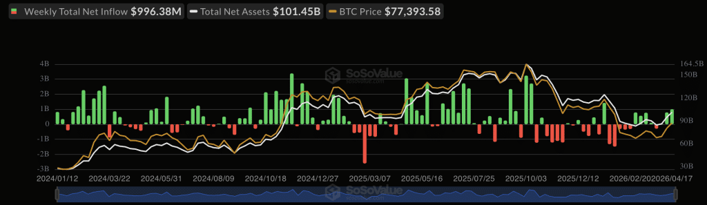 Spot Bitcoin ETFs recorded $996.38 million in net inflows between April 13 and 17. This marks their strongest weekly performance since mid-January, according to reports. Most of that came on Friday, which alone saw $663.9 million in inflows.