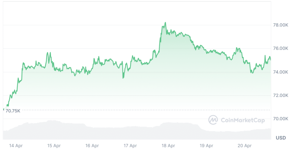 At press time, BTC was trading at $75,058.51 following a slight correction. Over the past week, the asset recorded a rise of nearly 6%.
