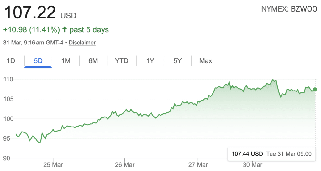 Brent crude has risen more than 10% in the past five days. During this period, the price went from a low of $94 to a high of $109.80. Brent crude is currently priced at $107.50.