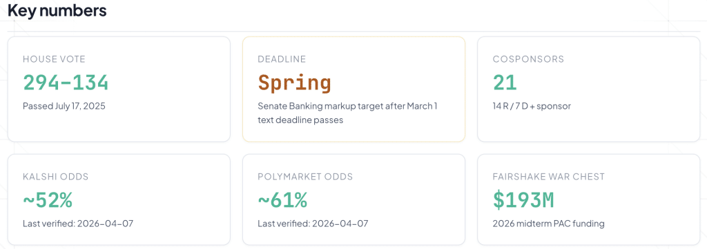 This clears the way for a Senate Banking Committee markup. This is currently targeted for April 13. Prediction markets suggest growing confidence, with Polymarket placing the odds of passage in 2026 at around 61%.