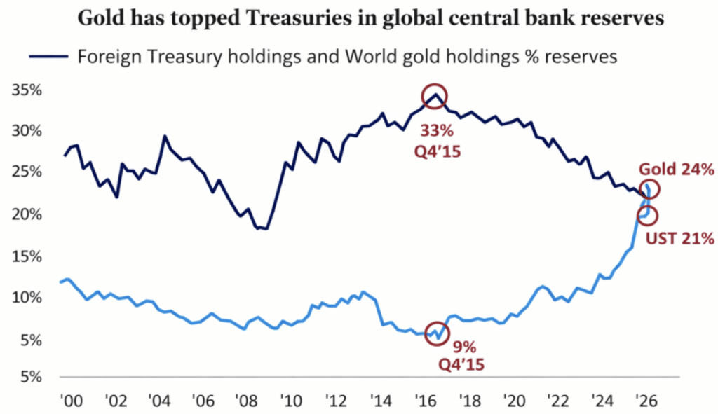 The Iran war’s impact is starting to show up in places beyond oil prices. There are early signs of de-dollarization picking up pace. Particularly, in how central banks are managing reserves and how energy trade is being settled. Since late February, foreign central banks have reduced their holdings of US Treasuries, while the petrodollar system that has supported global dollar demand for decades is facing some pressure.