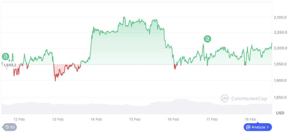 Forecasts suggest this trend is only beginning. Standard Chartered estimates tokenized assets could grow into a $2 trillion market by 2028. Ethereum is reportedly expected to remain a central hub due to its liquidity and institutional adoption. Amidst this, ETH recorded a notable increase in its price over the past week. The asset rose by 3.2% during this period and is currently trading at $2,017.25.