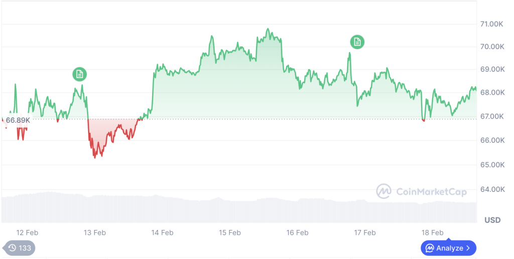 Bitcoin’s size also makes it harder to ignore. Its total market value remains above $1 trillion, according to CoinMarketCap. That scale has helped push Bitcoin into conversations inside traditional finance. The world’s largest cryptocurrency was trading at $68,072.01 following a 2.08% rise throughout the past week.