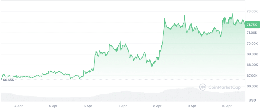 The king coin has recorded a notable rise over the past week. Bitcoin’s price went from a low of $66,500 to a high of $73,107.27 earlier today. Following a slight correction, BTC was trading at $71,770.89 during press time. It should be noted that the world’s largest cryptocurrency pocketed gains of 1% and 7.34% over the past day and week, respectively.