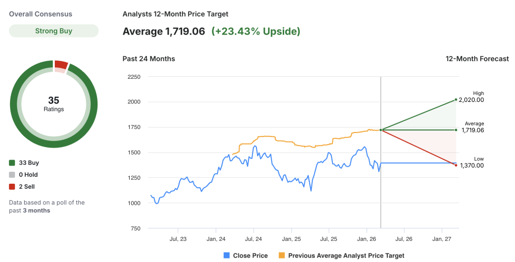 Shares of Reliance Industries Ltd. (RELIANCE.NS) are suddenly under the spotlight. The stock was trading around 1,393 INR earlier today, down about 1.1%. Amidst this, analysts remain positive about the firm’s outlook. About 30-35 analysts place the average 12-month price target near 1,719 INR, with the most bullish forecast reaching around 2,020 INR.