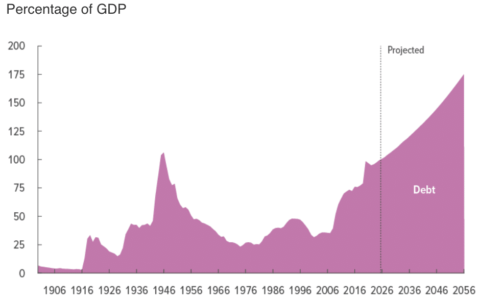 Long-term projections point in the same direction. The Congressional Budget Office estimates that debt held by the public will increase from about 101% of GDP today to about 120% by 2036.