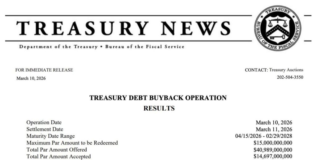 The US Treasury is currently under the spotlight as it has completed a $14.7 billion debt repurchase. This is part of a broader US Treasury buyback operation that helps to manage outstanding government debt while supporting trading conditions in the market. According to the US Treasury Bureau of the Fiscal Service, the operation accepted $14.697 billion in Treasury securities out of the $40.9 billion offered. Along with this, maturities were seen ranging between April 2026 and February 2028. The buyback settled earlier today had a maximum purchase limit of $15 billion.