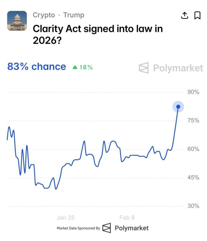 Meanwhile, prediction markets reflect rising expectations. On Polymarket, the odds of crypto market structure legislation passing this year recently climbed to 83%. Traders are betting that Washington will reach a decision.