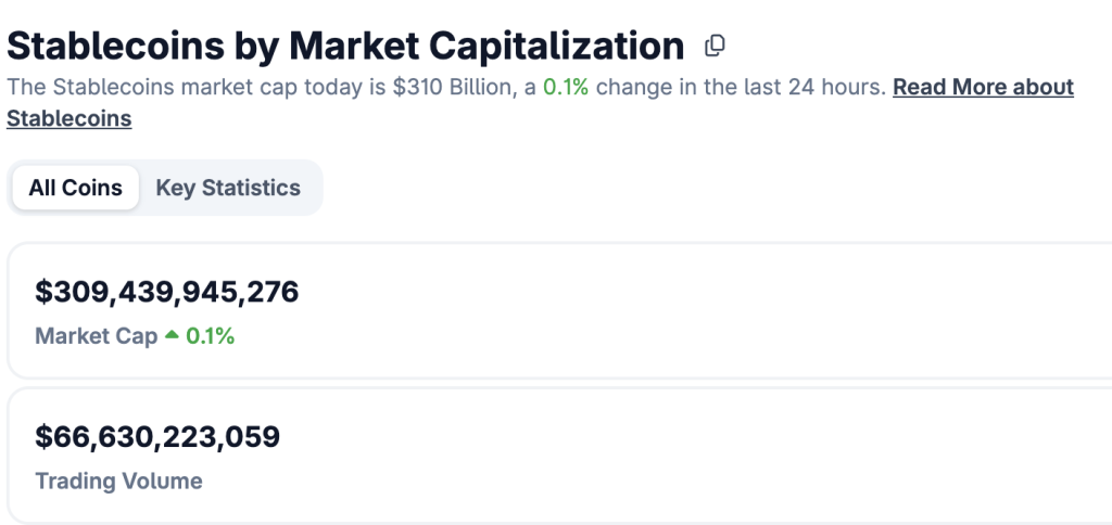 Stablecoins are currently too big to ignore. Their total market value is above $309 billion, according to data from CoinGecko. That number shows how deeply stablecoins are tied to crypto trading and payments.