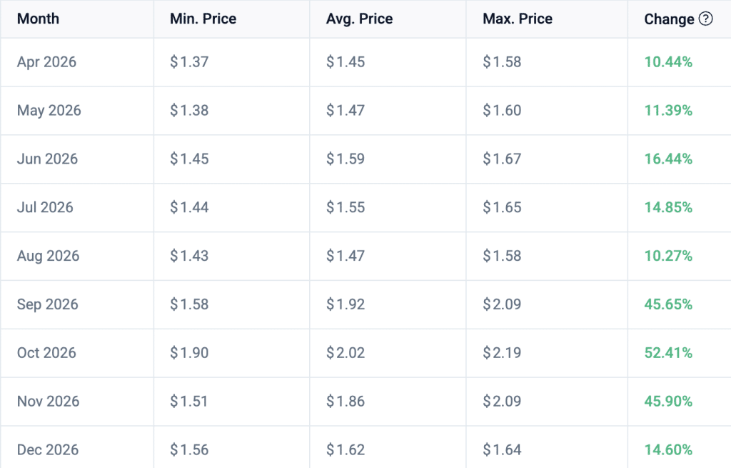 It should be noted that CoinCodex places XRP between $1.37 and $2.19 in 2026. This comes with an average price of $1.66. According to the firm, the altcoin will reach this peak in October 2026. This marks a 52.40% rise from its current price level.