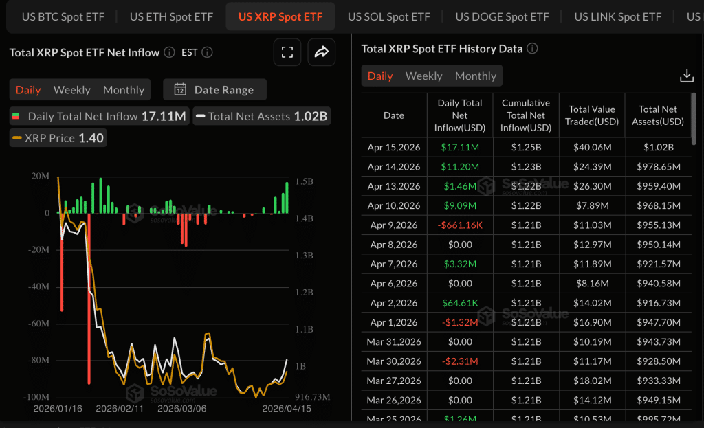 According to reports, XRP’s price action has remained stable and is rising due to the surging demand. Data from SoSoValue shows US-listed spot XRP ETFs recorded about $17 million in inflows in a single day. This is up from about $11 million the day before. In addition, total cumulative inflows have reached around $1.25 billion, with assets under management averaging $1.02 billion.